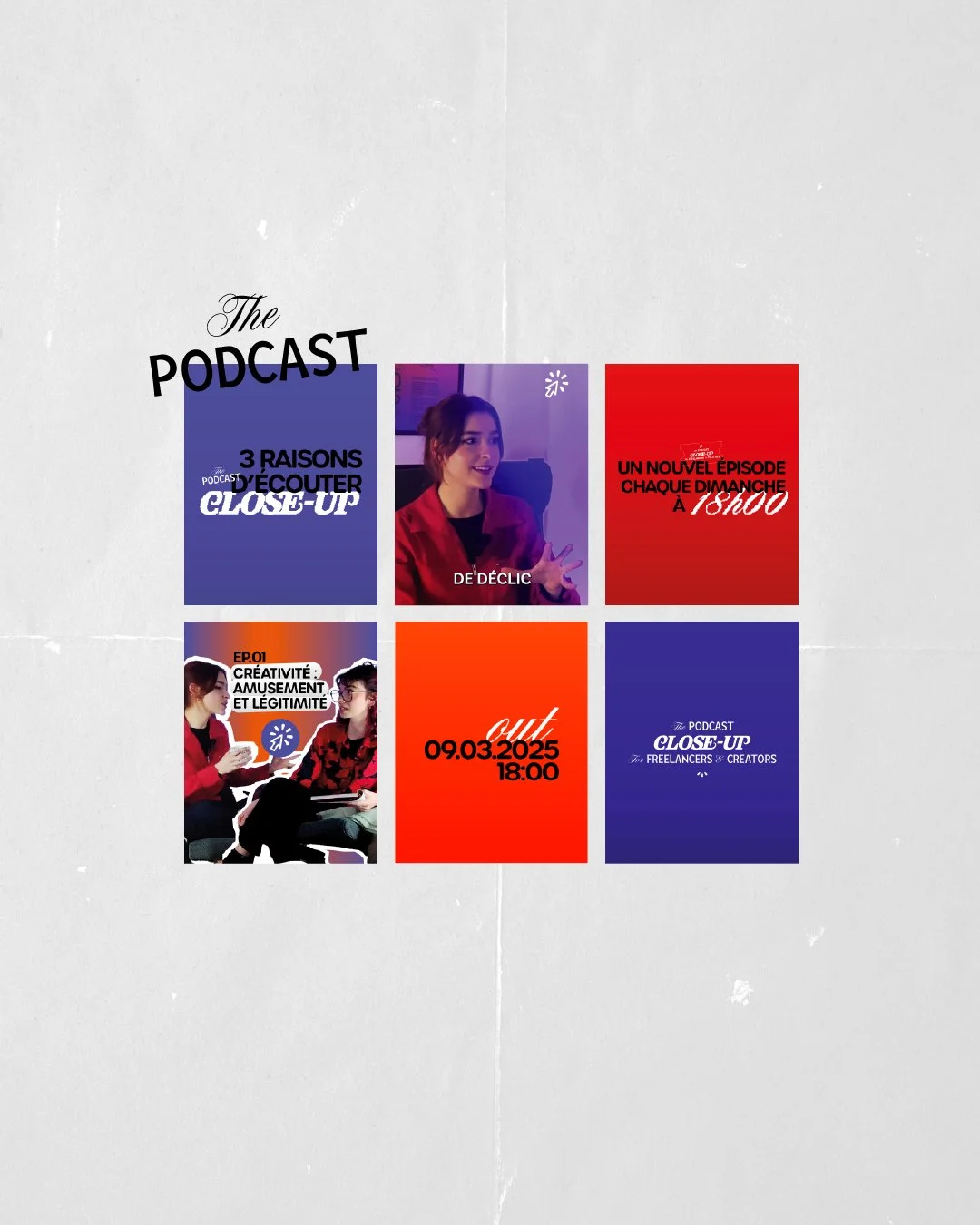 Développement de l’identité de marque d’un podcast destiné aux entrepreneurs et aux profils créatifs, dans une ambiance rétro moderne. Stratégie de mise en place du podcast, ainsi que contenu réseaux sociaux.
